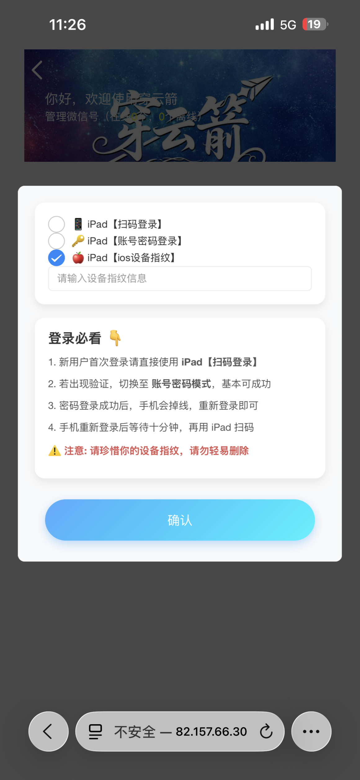 然后登入回官微。打开穿云网页、选择第三种【ios设备指纹】点确定、用官微扫码登入即可